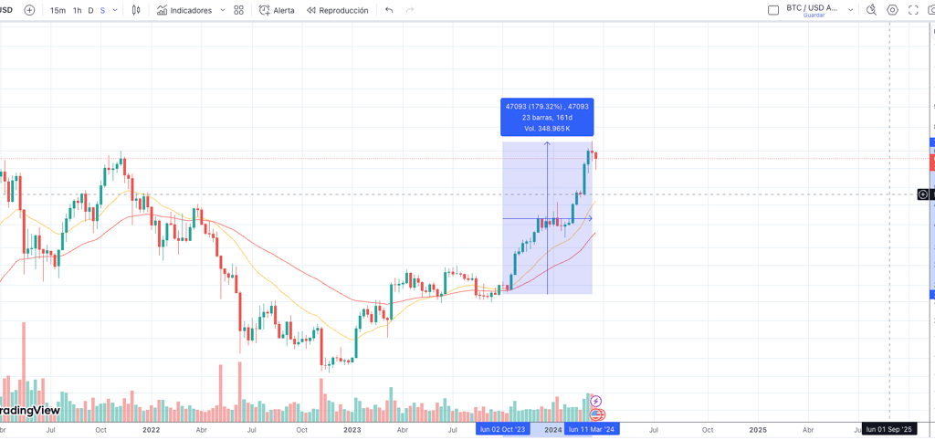Hace una semana el Bitcoin alcanzó nuevo máximo histórico por encima de los $73.000. Es la primera vez en la historia de la criptomoneda que esta obtiene un nuevo ATH (All time high) antes de que suceda el Halving. Esto sin duda marca un nuevo escenario completamente diferente a los anteriores y que tendrá un impacto mayor, tanto el precio del activo, como en el mercado de las criptomonedas en general.