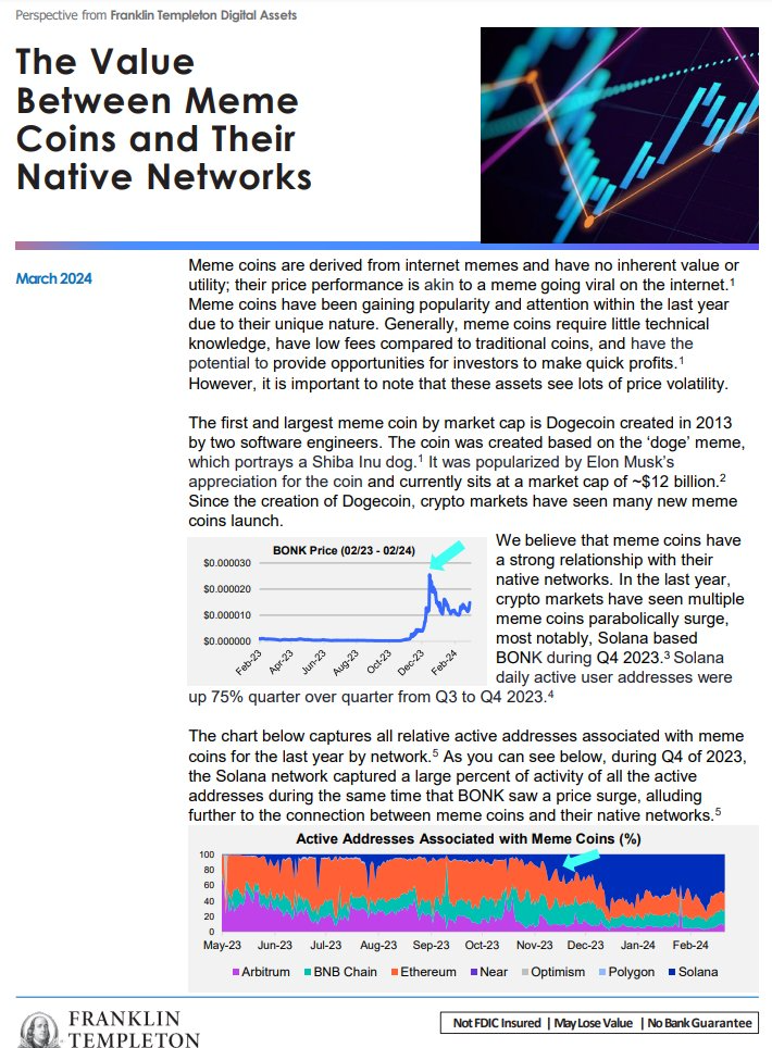 Finalmente, tampoco debemos decir que los memecoins en términos generales no importan, pues ya forman parte fundamental del mercado cripto y su importancia y aceptación es cada vez mayor. Incluso se encuentran bajo análisis de instituciones tradicionales, donde hace unos años era inimaginable que se sumergieran en criptomonedas y mucho menos aún en memecoins. Tal es el caso del fondo de inversiones Franklin Templeton, que publicó un reporte sobre el valor entre los memecoins y sus redes nativas y que además menciona abiertamente en su sitio web que sus inversiones en activos digitales incluyen stablecoins y sí, memecoins. Por tanto, los memes dejaron de ser algo puramente de "degens" y gente del común para convertirse en algo más.