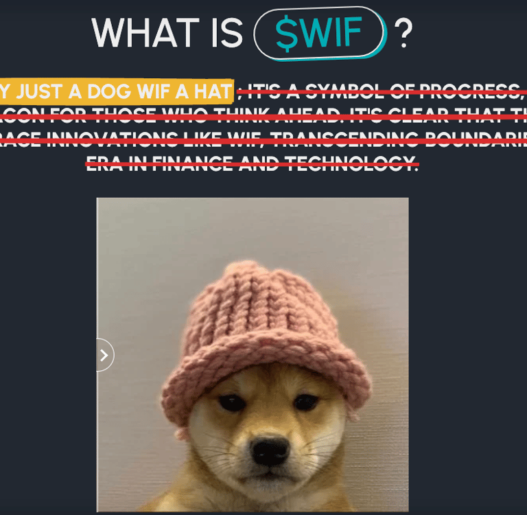 Un claro y sorprendente ejemplo puede ser el memecoin llamado DogWifHat ($WIF) de la red de Solana, el cual tiene una capitalización de mercado actual que ronda los 3.5 billones de dólares, pasando de un precio de $0.17 el 1 de enero de 2024 a encontrarse actualmente alrededor de $3.5. Desde su precio mínimo a la fecha, este "activo" ha tenido un crecimiento del 225,510% en 6 meses. Para hacer un paralelo, $WIF vale 3 veces más que Spirit Airlines, aerolínea americana de bajo costo. Esto parece bastante ridículo viéndolo desde esta perspectiva, más si se tiene en cuenta que lo único que ofrece este memecoin es un perro con un sombrero, tal como su website lo indica.